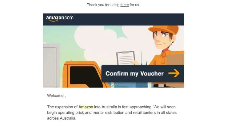 "The expansion of Amazon into Australia is fast approaching," the email begins. "We will soon begin operating brick and mortar distribution and retail centers in all states across Australia." I suspect that if Amazon does want to communicate with Australian customers, it will know to use the Australian spelling of "centre", not the US one. That's an immediate flag that this is a scam.